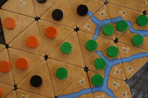 “[Cartography] is heavily influenced by Go, but I think the complete transformation of the board from a 19×19 grid to a shifting array of triangular tiles and walls has completely changed the game, if you’ll pardon the semi-pun. Its constant evolution during play means that a) you’re never totally sure of your position, as your opponent could suddenly open up new fronts you weren’t expecting, and b) every game is different….”
