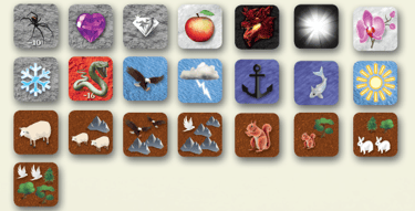 Die Spieler teilen sich die Verwemdimg vom 22 Symbolplättchen und bis zu 45 Plättchen mit brauner Farbe auf mindestens einer Seite:
