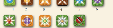 Die Spieler teilen sich die Verwendung von 108 Blöcken: 27 in grün, braun, dunkelgrün & dunkelbraun.