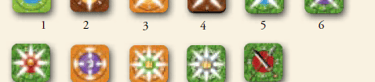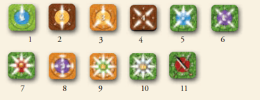 Spieler teilen sich die Verwendung von 44 Ziegeln: 11 in grün, braun, dunkelgrün und dunkelbraun.