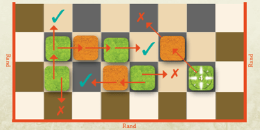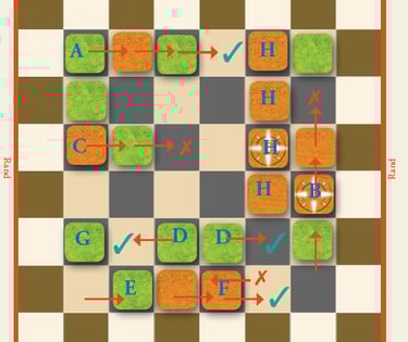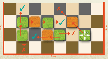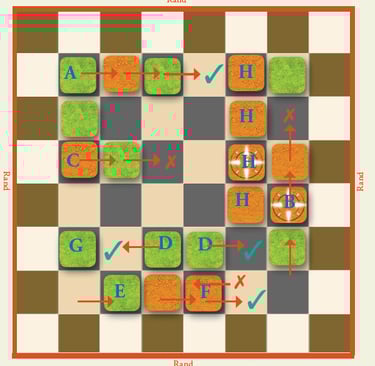 Die grüne Idee E ist näher am Rand als die braune Idee E, sodass die Reihe nur vom grünen Spieler verschoben werden kann. Eine einzelne Idee G kann nicht geschoben werden, da es nicth in einer Reihe liegt.