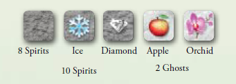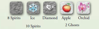 10 spirits and 2 ghosts are placed on open but not adjacent squares before people tiles are placed. Everyone can move any of the spirit or ghost tiles in sight instead of people. The first player to move the apple, or a stack with the apple on top of it, onto one of their own visible tiles has chosen to die and becomes a spirit till the end of play.