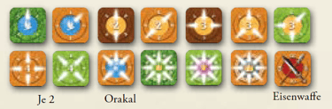 Die Spieler teilen sich den Einsatz von 4 Eisenwaffen: in Grün, Braun, Dunkelgrün & Dunkelbraun, sowie 4 Berge:
